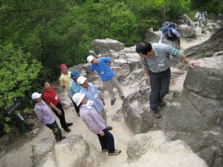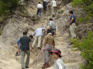 次は、いよいよ受講生の出番です。基本は足。できるだけ地面に垂直にたって、足場を良く見て3点支持!! 少しずつ少しずつ、あがっていってください。「そこじゃなくて、ここ!!」 他には、手袋はつけない。ストック等で手をふさがない。靴ヒモをしめて、足がぐらぐらしないように!! 石を落としたときは、「ラック!!!」と叫ぶ!「ラック」と聞こえたときは、上を見て避ける。岩場は覚えるが多いなあ~。