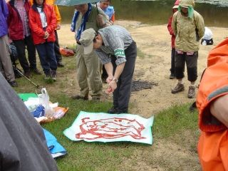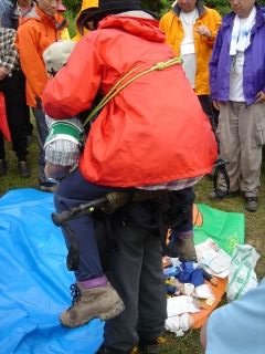 写真は、ザック、ストック、マットで人を楽に背負う方法。 そのあと、ストックで松葉杖を作る方法も実演。へぇ~ストックっていろいろ使えるんだな~。