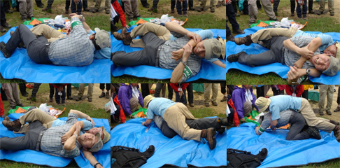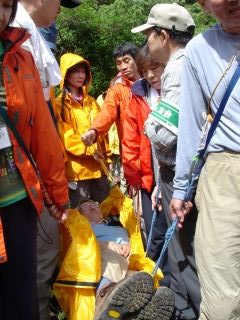 次は、動けなくなった人の背負い方。まったく動けなくなった人を背負うのは、大変。まずは、横に寝て、回転するようにしてぐっと背負う。 楽しそうな。。。苦しそうな。。。なんだか変な感じです。